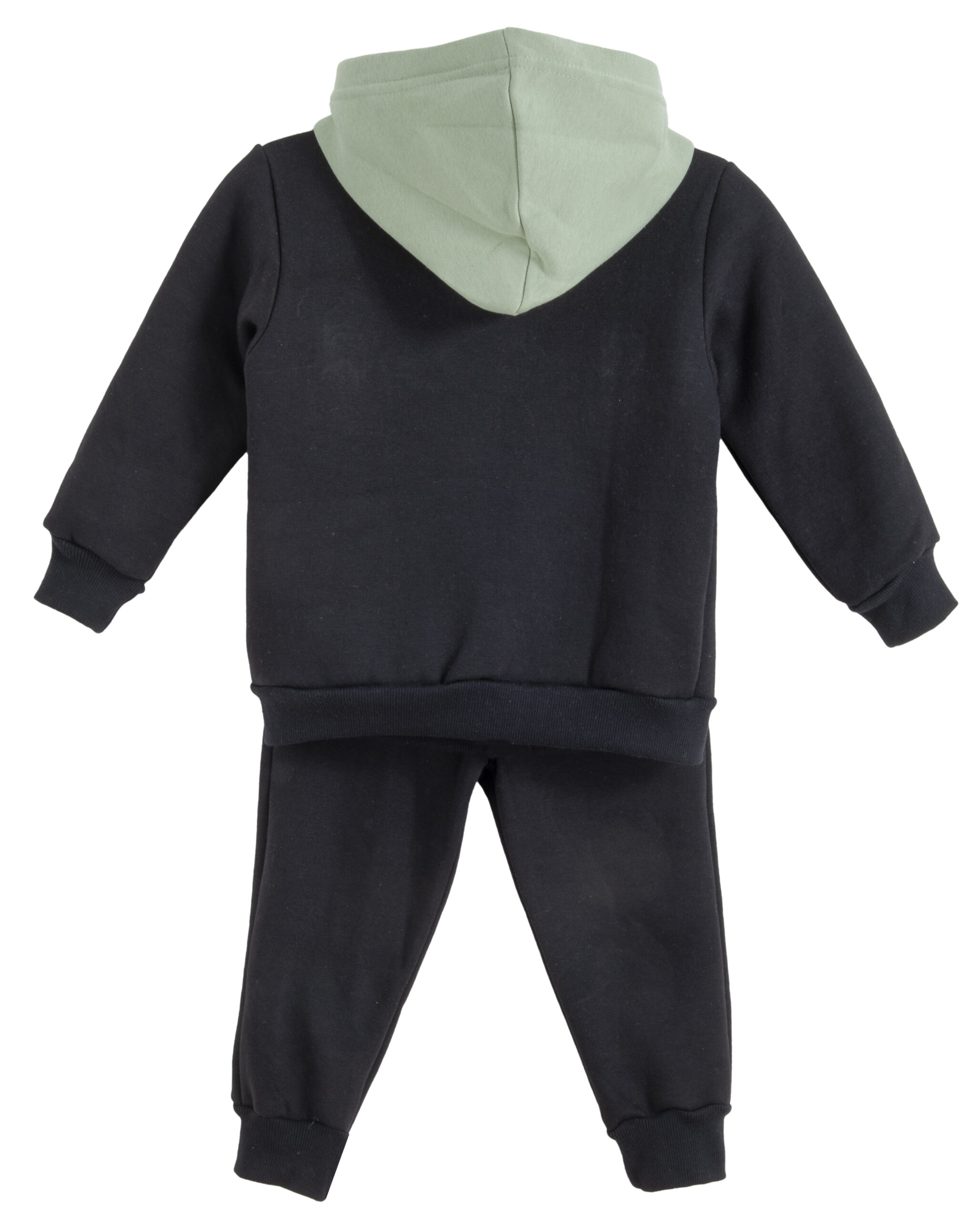 Σετ φόρμες με ζακέτα 3 τεμαχίων με βεραμάν μπλούζα με στάμπα και μαύρο παντελόνι. Η ζακέτα είναι μαύρη με κουκούλα.
