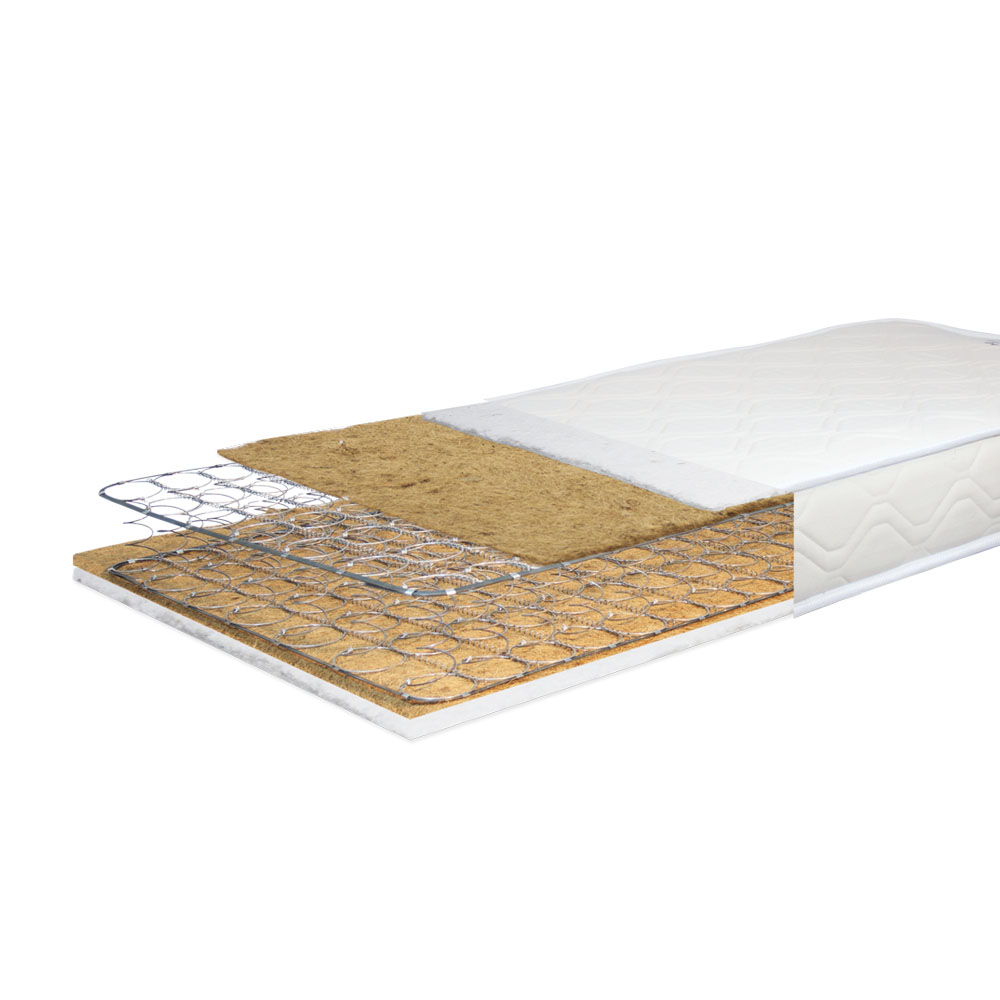 – Ύφασμα κρετόν βαμβακερό- Βαμβακερή Βάτα- Στρώση Κοκοφοίνικα- Ελατήρια πάχους 2,40 mm – 108 ελατήρια / m2- Φερμουάρ- Πάχος 14cm ±1